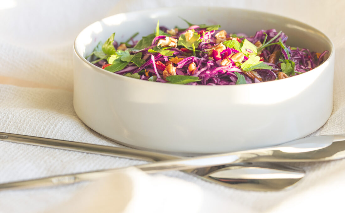 Une recette hivernale punchy et sexy : salade de chou rouge, noix de pécan, persil et baies de goji
